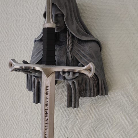 Myydään Koristeellinen fantasiamiekka, jossa on yksityiskohtainen metallinvärinen terä ja kahva. Kahvassa ja terässä on koristekaiverruksia ja fantasiatyylisiä muotoja. Miekka on kiinnitetty mustaan, pitkänomaiseen seinätaustalevyyn, jossa on valkoisia kuvioita. Sopii esimerkiksi sisustuselementiksi, keräilyesineeksi tai rekvisiitaksi. Miekka ja taustalevy muodostavat yhtenäisen seinälle ripustettavan kokonaisuuden.