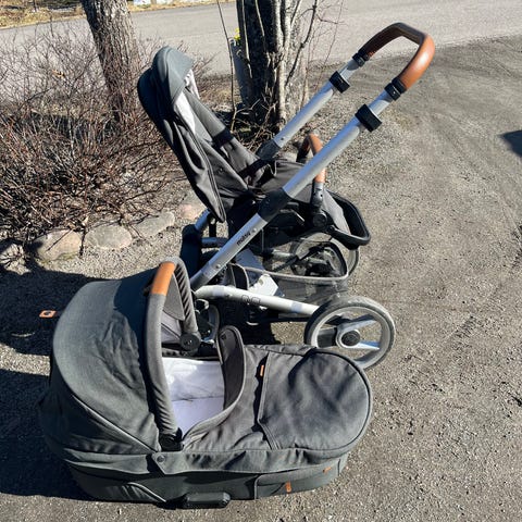 Myydään Mutsy Neo -lastenvaunut, väri vaaleanharmaa konjakkivärisellä nahkakahvalla.
