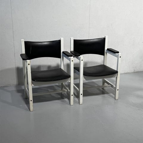 Toisessa tuolissa on pieni repeämä verhoilussa, mutta muuten tuolit ovat hyvässä kunnossa.