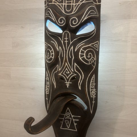 Itsetekemäni, puinen - koristeellinen seinälyhty. Mäntypuu käsitelty petsillä ja lakalla. Koko: korkeus 74 cm.