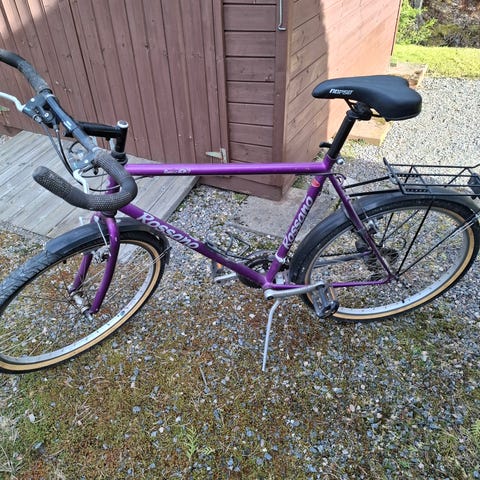 Monivärinen pyörä siinä on 3 vaihdetta jalkajarrut ja toimii.