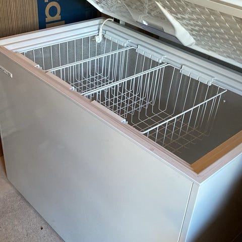 Valkoinen UPO arkkupakastin. Ylhäältä avattava malli, jossa irrotettava metallinen säilytyskori pienemmille tuotteille.