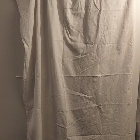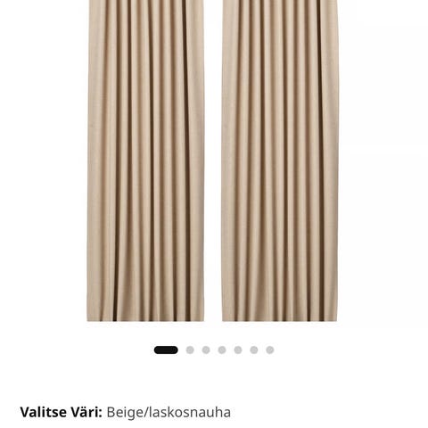 Tummanharmaat paksut kukkakuvioiset pimennysverhot. Ei täysin blokkaa valoa, mutta pimentää huoneen hyvin. Nurjalla näkyy yhdessä kohdassa pieniä lankajuoksuja, mutta ne eivät näy päällepäin.