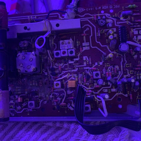 Sharp stereolaitteen piirilevy. Sopii käytettäväksi varaosana tai projektikäyttöön elektroniikka- ja hifilaitteiden rakentelussa tai korjauksessa. Piirilevyllä on erilaisia komponentteja, kuten kondensaattoreita, vastuksia ja liittimiä. Tarkempi yhteensopivuus ja tekniset tiedot eivät käy ilmi, joten ostajan on hyvä varmistaa sopivuus omaan laitteeseensa mittojen ja liitäntöjen perusteella. Vanhan kasettiradion piirilevy. Visuaalinen analyysi viittaa siihen, että se voi olla Sharpin (esim. GF-6262) tai Panasonicin (esim. RX-5010LS) laitteesta, koska näillä korteilla on samanlaisia rakenteita ja komponentteja kuin klassisilla japanilaisilla kasettiradioilla.
