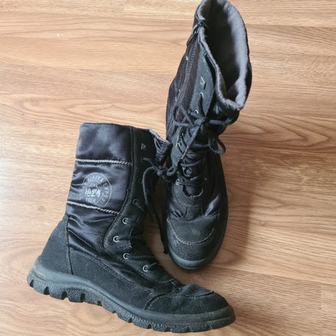 Lasten talvinilkkurit. Kunto tyydyttävä. Nupukkimaisessa pintamateriaalissa kolhuja kengän kärjissä. Katsothan kuvat tarkasti. Kengät olleet kaksi talvea käytössä. Pohjallisen sisämitta 24 cm. Kengän korkeus 15 cm. Kengänvarressa tarrakiinnitys. Ostettu Stadiumista.