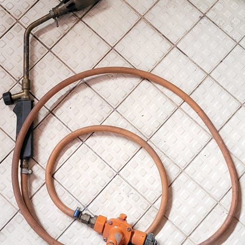 Kuvan BMV:n venttiili, jolla saa kaksi kaasupulloa kiinni yhteen kaasulaitteeseen. Pullon vaihto onnistuu manuaalisesti pyöräyttämällä päällä olevaa nuolta. Ollut vuosia kaapissa, toimivuutta ei ole testattu, kun ei ole kaasua.