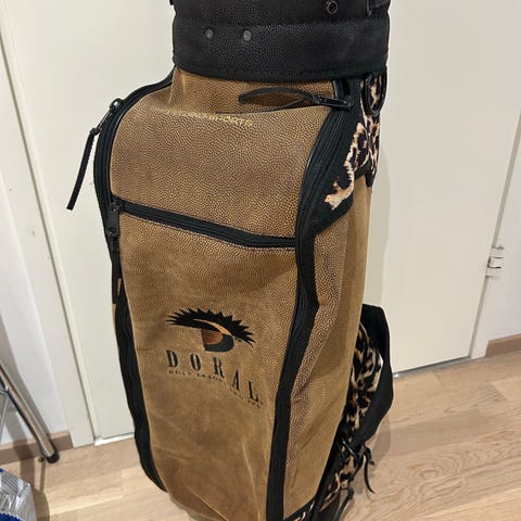 Golfbägi, erittäin pienellä käytöllä ollut, siistikuntoinen. Värinä kulta/beige. Laukussa on useita vetoketjullisia taskuja. Olkahihna.