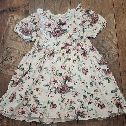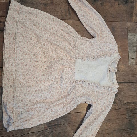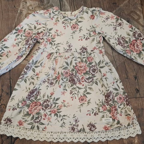 Newbie mekko tytöille, koko 98. Mekko on valmistettu puuvillasta ja siinä on monivärinen kukkakuvio. Pitkähihainen malli, jossa on röyhelöhelma ja etukappaleella röyhelöyksityiskohta. Sopii arki- ja juhlakäyttöön. Kuviointi ja värit näkyvät tarkemmin kuvissa.