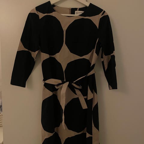 Marimekko naisten Siirtolapuutarha-mekko, koko 34. Materiaalina puuvilla. Malli on suoralinjainen ja pituudeltaan polven tuntumaan, hihat noin 3/4-pituiset. Takana vetoketju.