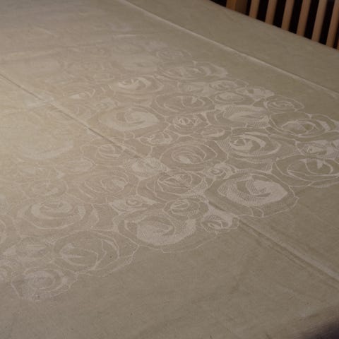 Luonnonvaalea Dora Jungin Tampellalle suunnittelema pyöreä Sata Ruusua -pöytäliina 150cm halkaisijaltaan. Ruusukuvio keskellä n. 60x60cm. Kuvan pöytä 75cm halkaisijaltaan.