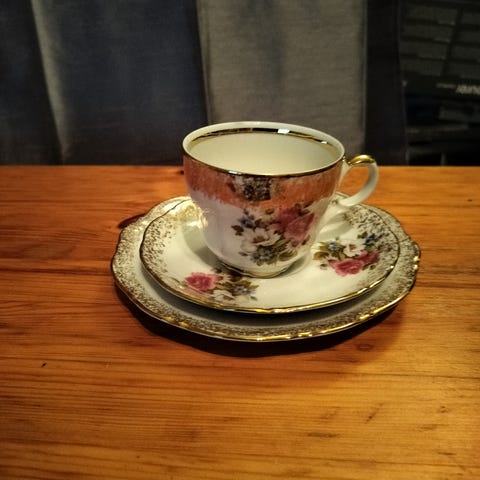 Posliininen kahviastiasto, jossa sinivalkoinen kukkakuviointi. Kokonaisuuteen kuuluu kahvikannu, useita kahvikuppeja ja aluslautasia sekä kermakko ja sokerikko. Astiat on suunniteltu kahvin ja teen tarjoiluun, ja ne soveltuvat arki- ja juhlakäyttöön. Klassinen sinivalkoinen väritys ja kukkakoristelu luovat yhtenäisen ilmeen koko astiastolle.