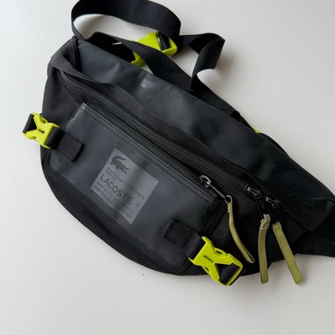 Musta nahkainen passikotelo, jossa on Lacosten logo ja matkatavaralappu sekä nahkahihna matkalaukkuun kiinnittämistä varten.