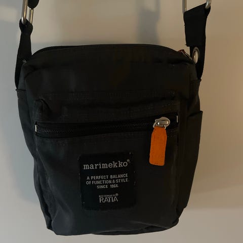 Marimekko olkalaukku unisex-käyttöön. Materiaalina kangas, väri musta. Laukussa on säädettävä olkahihna ja etupuolella vetoketjutasku. Läpän alla on avotaskuja ja sisätila pienille tavaroille, kuten puhelimelle, lompakolle ja avaimille. Sopii arjen käyttöön ja mukaan esimerkiksi kaupunkiasioille tai matkalle.