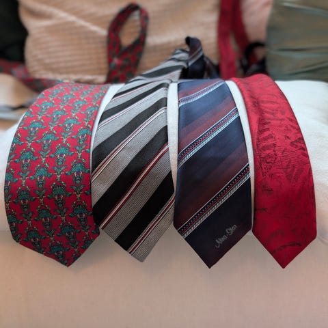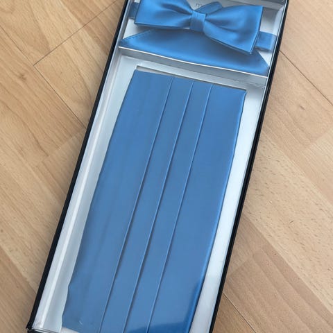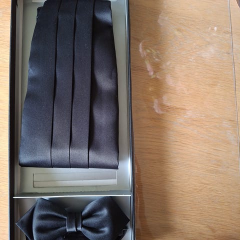 Miesten juhlasetti, johon kuuluu kaksi solmuketta ja kaksi plastronia. Toinen setti on harmaa ja toinen punainen. Sopii esimerkiksi juhlapukeutumiseen, kuten häihin tai muihin tilaisuuksiin, joissa tarvitaan siistiä asustusta puvun tai smokin kanssa. Materiaali näyttää sileäpintaiselta, kiiltävältä kankaalta.