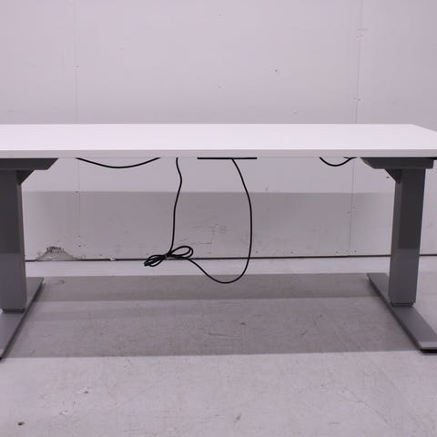Martela Pinta EQ sähköpöytä. Valkoinen runko ja valkoinen kansi. Kannessa läpivientiaukot.