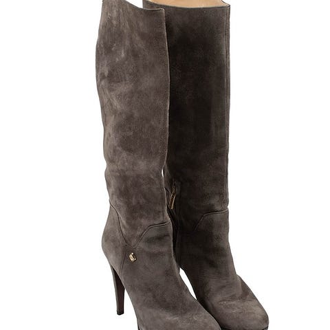Liu Jo saappaat, koko 38. Värinä beige/taupe. Polven yläpuolelle ulottuva malli, jossa joustava varsi ja nauhakiinnitys ylhäällä. Materiaali pehmeä mokkapintainen. Harmikseni itselleni vähän pienet.