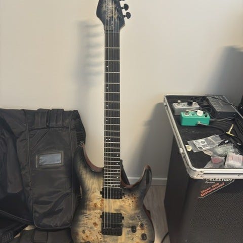 • Kitara: Schecter Banshee Extreme 6 (Väri: Charcoal Burst). Upea loimukoivukansi ja erittäin mukava kaula. Schecterin laatu takaa, että matalat vireet soivat selkeästi ja napakasti.