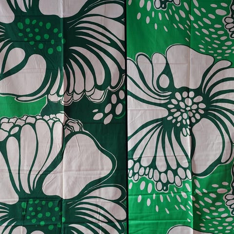 Hyväkuntoinen Verho/kangas päät ommeltu, toisessa päässä taitos eri kankaasta, josta kuva