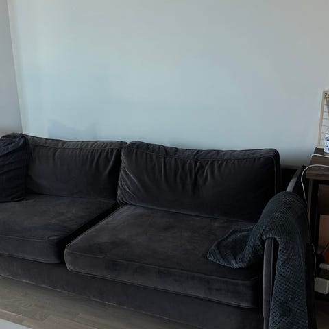 Myydään hyvässä kunnossa oleva musta samettisohva, jossa pehmeät jousitetut istuintyynyt ja irroitettavat kankaat.