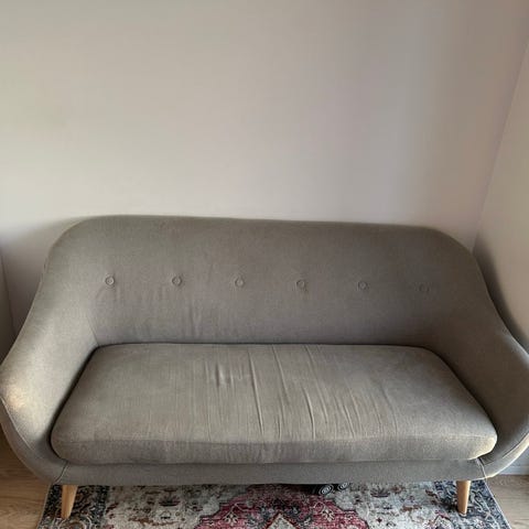 3-istuttava kangassohva. Istuintyyny pussijousilla ja vaahtomuovilla. Selkätyyny vaahtomuovia. Jalat massiivipuuta. L210 x K85 x S84 cm