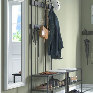 Naulakko, kenkäteline ja penkki samassa kalusteessa. Mitat: 79 cm leveä, 190 cm korkea ja 35 cm syvä.
