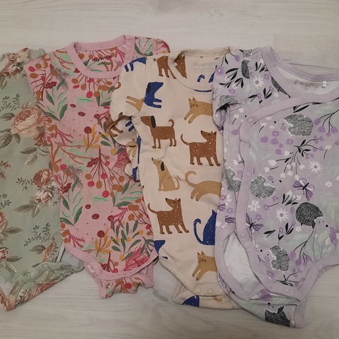 Myydään paita, body, housut ja yöpuku tytölle noin koossa 74-80 cm. Näissä vaatteissa on jo sanomista: housuissa (Marimekko) polvessa reikä, body hyvässä käytetyssä kunnossa, paitaan on piirretty eikä lähde pesussa, yöpuvussa minireikä.