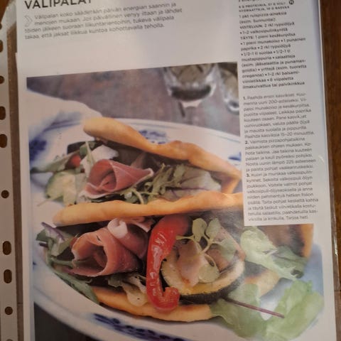 Monia reseptejä, jossa on useita sivuja erilaisia ruokaohjeita. Teksti on selkeää ja jaettu otsikoihin, ainesosaluetteloihin ja valmistusohjeisiin. Reseptit ovat muovitaskuissa, mikä suojaa sivuja käytön aikana.