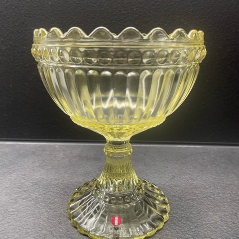 Iittala jalallinen lasikulho. Kulho on keltaista lasia ja siinä on kohokuvioitu, raidallinen ja pyöreä koristekuviointi sekä aaltoileva reuna. Sopii esimerkiksi jälkiruokien, pienten naposteltavien tai kattauksen tarjoiluastiaksi.