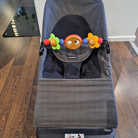 Erittäin hyväkuntoinen babysitteri lelukaarella. Sitterin kangas joikun mustapäällinen korvilla.
