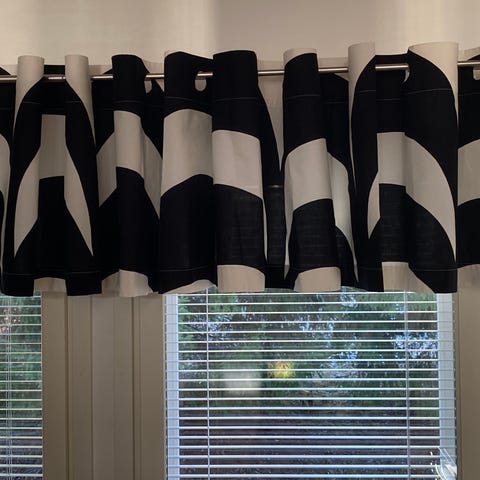 Marimekon Quilt kankaasta kappa. Väri; luonnonvalkoisella pohjalla vaaleanpunaista ja tummansinistä ruutukuviota. Korkeus 50cm, pituus 144cm, tankokuja 4cm. Kapan voi myös halutessaan kiinnittää nipsuilla. Materiaali puolipellavaa, uusi.