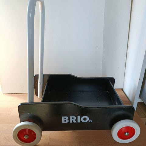 BRIO puinen kävelyvaunu, väri musta valkoisilla ja punaisilla yksityiskohdilla. Vaunussa on metallinen työntöaisa ja neljä pyörää. Soveltuu pienten lasten kävelyn harjoitteluun ja lelujen kuljettamiseen sisätiloissa. Runko on puuta ja pyörissä on kumireunat lattioiden suojaamiseksi. Kuvissa näkyy käytön jälkiä rungossa. Ohjaus puoltaa hieman.