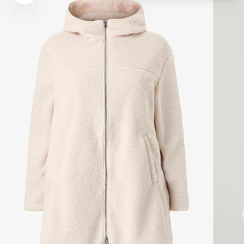Ellos Short pile jacket naisten ’fleece’takki. Teddytyyppistä materiaalia, polyester. Koko XL. (48/50). Väri luonnonvalkoinen. Takissa on pehmeä, lyhytnukkainen pinta ja sileä vuori. Ei resoreita helmassa eikä hihansuissa. Edessä kokopitkä vetoketju. Lyhyehkö ja väljä malli. Laput kiinni, ei käytetty.