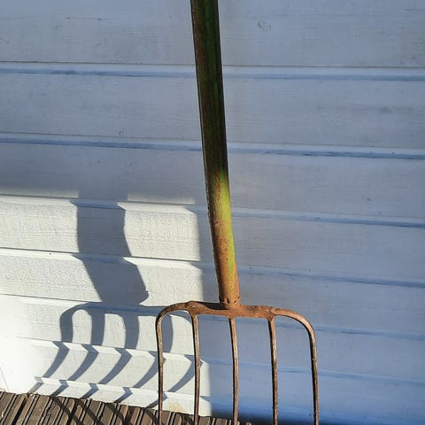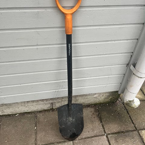 Metallinen sininen Fiskars lapio ja metallinen Fiskars talikko.