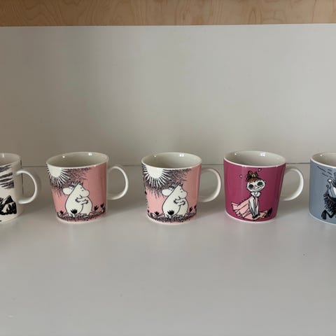Lähes käyttämättömät Nuuskamuikkunen Muumi-mukit, 4 kpl. Korkeus 8 cm, halkaisija 8 cm. Ollut tuotannossa vuosina 2002-2014. Kaikki mukit yhteensä 60 e.
