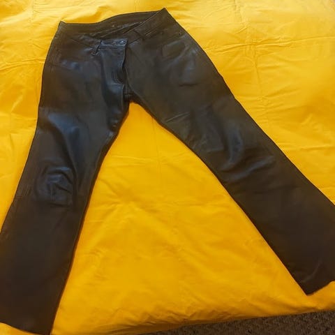 Siistissä kunnossa, aitoa nahkaa olevat housut kokoa M, mutta vastaa enemmän kokoa L. Lyhyehkö malli.