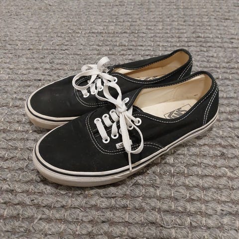 Vans tennarit, koko 41. Väri musta-valkoinen, valkoiset nauhat ja kumipohja. Päällinen kangas- ja mokkamateriaalia, ulkopohjassa perinteinen Vansin waffle-kuvio. Soveltuvat arkikäyttöön ja vapaa-aikaan. Kuvaan merkattu kolme pientä kankaan halkeamaa kantaosassa kenkiä.