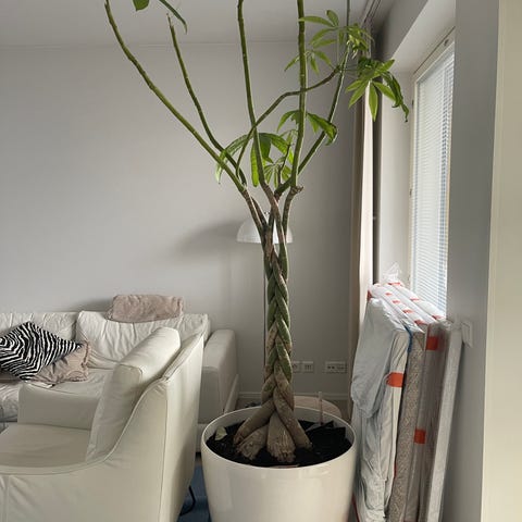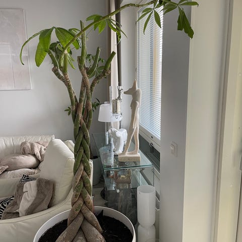 Viherkasvi valkoisessa korkeassa ruukussa. Pitkät, kapeat vihreät lehdet ja puumainen varsi. Muistelisin, että kyseessä traakkipuu. Ollut meillä 15vuotta ja kasvanut pienestä viherkasvista isoksi. Myydään kun alkaa olla meille jo liian iso.