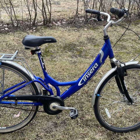 Pyörässä on suora ohjaustanko, käsijarrut, lokasuojat, ketjusuoja sekä tavarateline.