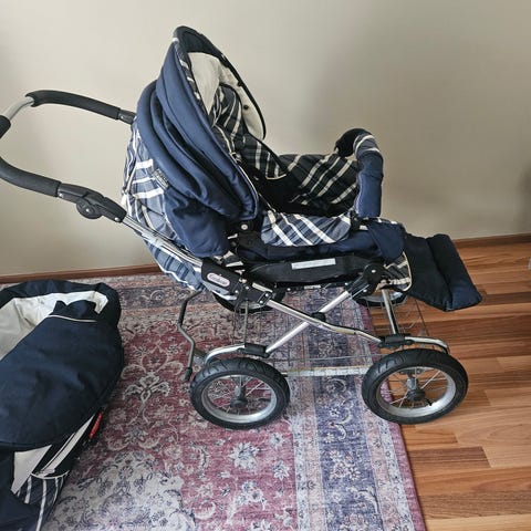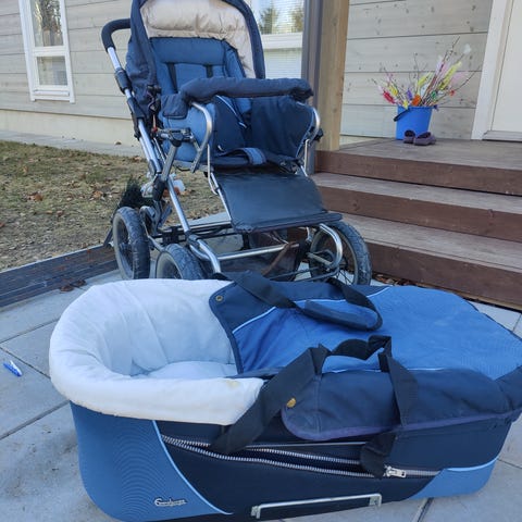 Hyvä kuntoiset yhdistelmävaunut säädettävällä aisan pituudella. Paketti sisältää vaunut, vauvakoppa, istuinosa, hoitolaukku, hoitoalustat 2kpl ja sadesuojan. Istuinosaan ja vauvakoppaan kuuluu myös omat "jalkasuojat".