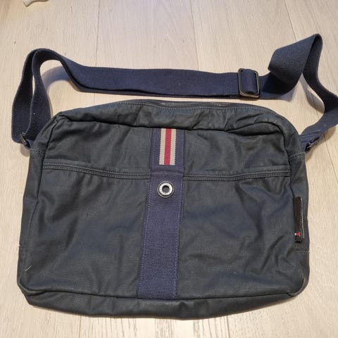 Väri on musta vaikka kuvissa aurinko muuttaa väriä harmaammaksi. Kaksi vetoketjutaskua, joista isommassa vielä erillinen tasku sisäpuolella. Hihna on miellyttävän pehmeä Hilfigerin printillä varustettuna ja säätövaraa löytyy mukavasti eri käyttötarkoituksiin.