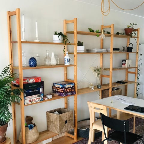 Puu osissa ajan tuomaa jälkeä, on tukeva ja kaikki osat mukana, myös hyllyn kannattimet. Alkuperäinen käsittely pinnassa.