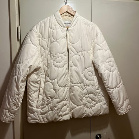 -Takissa on korkea kaulus ja irrotettava huppu, etupuolella vetoketjukiinnitys.