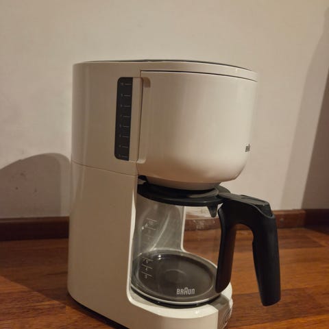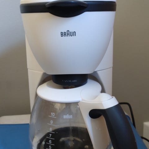 Braun kahvinkeitin, jossa lasinen mitta-asteikolla varustettu kannu ja musta muovirunko. Laitteessa on yläosassa suodatinpidike ja tippalukollinen kansi. Sopii tavallisten suodatinpussien käyttöön. Kahvinkeittimen alla on lämpölevy, joka pitää kahvin lämpimänä. Keittimessä käytön jälkiä, muttaa keittää kuumat kahvit.