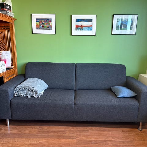 Myynnissä hyväkuntoinen 2 istuttava sohva, jossa tummanharmaa kangasverhoilu. Palvellut hyvin kymmenisen vuotta. Kangas ehjä kaikkialta, ei tahroja. Istuintyynyt eivät ole irrotettavissa.