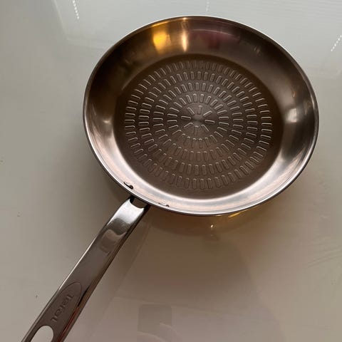 Tefal paistinpannu ruostumattomasta teräksestä. Pannussa on teräspohja ja metallinen kahva. Soveltuu yleiseen ruoanlaittoon liedellä. Halkaisija 29cm