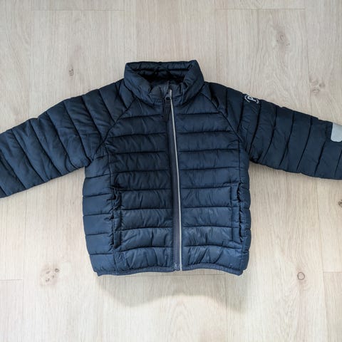 Yhdellä lapsella vain kauppareissuilla käytetty takki. Todella hyvässä kunnossa. Sisäpuolella nepparit alustakin kiinnitystä varten.