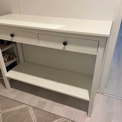 Puinen valkoiseksi maalattu sivutaso. Korkeus 75cm, leveys 120cm ja syvyys 36 cm.