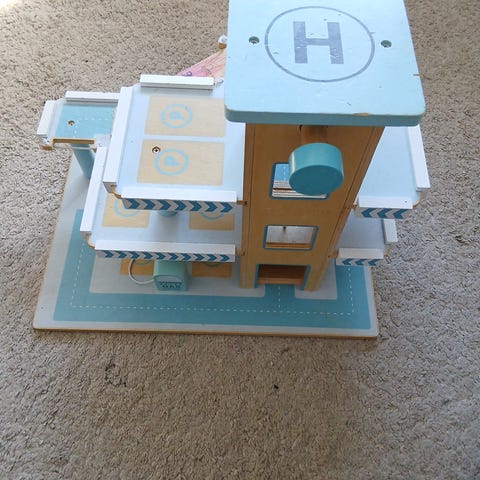 Hyvässä kunnossa oleva parkkitalo. Käytön jälkiä pahveissa ja tarroissa. Monta kerrosta ja korkeutta yli 85cm. Veivillä toimiva hissi. Toimii kaikilla perus pikkuautoilla.