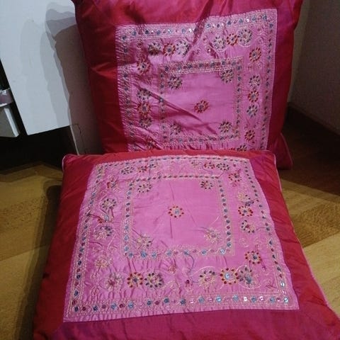 Käyttämättömät sohvatyynyt sisätyynyineen 3kpl. Koko 36x36cm. Tummanharmaa pohja, jossa aniliininpunertava kuviointi.