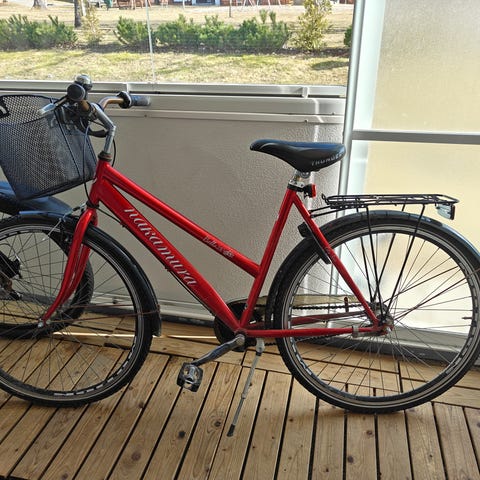 Toimiva pyörä, mutta nähnyt jo elämää. Pyörän kori on hieman vääntynyt ja jalkaan tarvitaan ainakin uusi pää, ruostetta myös näkyvissä rungossa, mutta asiaa ei ole yritetty korjata.